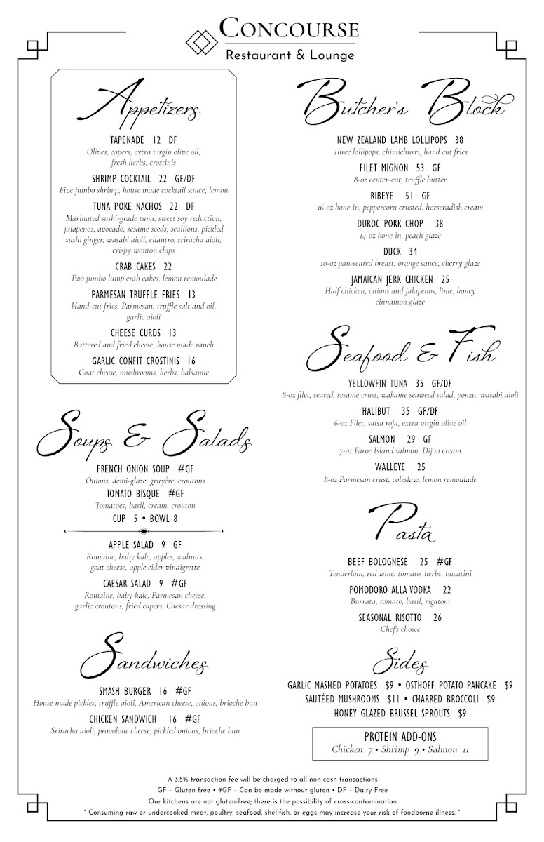 As you step into the Concourse, you are immediately greeted by a friendly staff eager to enhance your dining experience. The ambiance is enriched by stunning floor-to-ceiling windows that offer captivating views of the lake, complemented by cozy booths and an inviting fireplace. Whether you choose to relax on the shaded terrace or unwind in the lively bar area, every corner of this establishment reflects a commitment to quality and exceptional service.